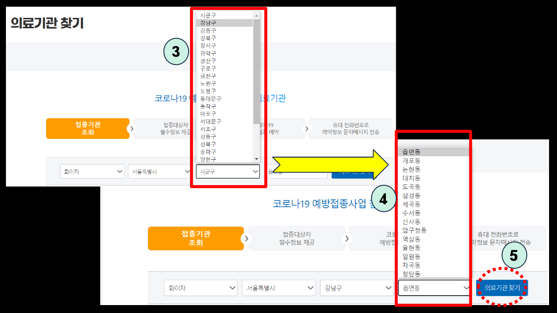 이제 화이자백신과 서울특별시를 선택했다면 저희집과 가장 가까운 강남구를 선택하고 세곡동을 선택한후에 의료기관찾기를 눌러주시면 됩니다.