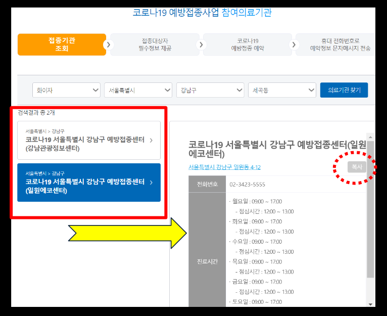 이렇게 의료기관찾기를 눌러주셨으면, 화면과 같이 나오는데요, 왼쪽에 병원을 눌러주시면 오른쪽과 같이 진료시간과 전화번호가 나옵니다. 위에 복사가 있는데, 복사를 해주시면됩니다. 복사를 하시면 질병관리청 사전예약 시스템으로 백신 접종 예약시 유용하게 쓰일것입니다.