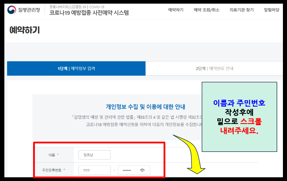 저는 본인예약을 누른후에 이름과 주민번호를 입력해 줍니다. 그리고 아래로 조금만 내려주세요.