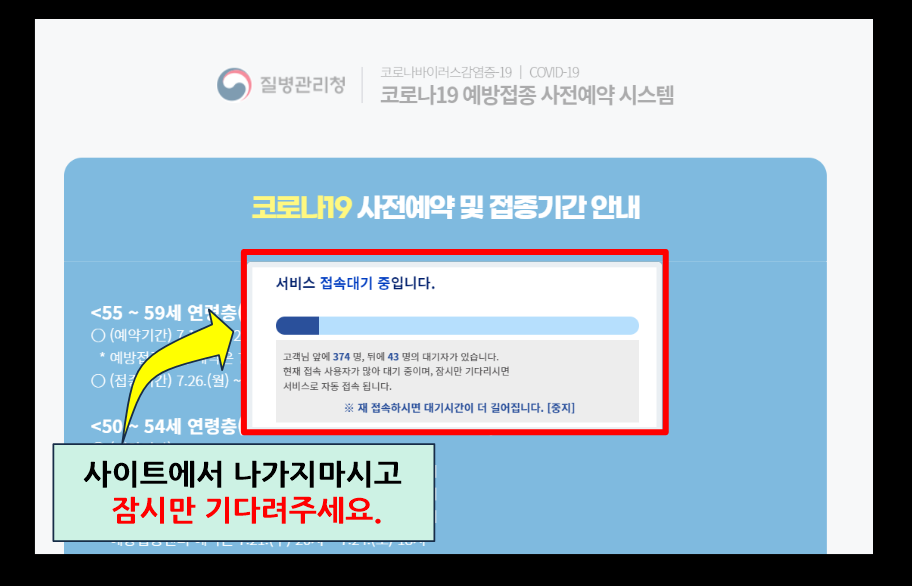 현재, 사전예약기간으로 50세부터 59세 백신예약과 60세~74세 백신예약으로 인해 홈페이지가 지연이 되고있습니다. 저는 새벽3시에 사이트에 들어갔기에 대기자가 몇명 없었지만, 여러분들은 대기자가 더 많으실수도 있습니다. 신경쓰지 마시고 사이트에 나가지 마시고 잠시만 기다려 주세요.