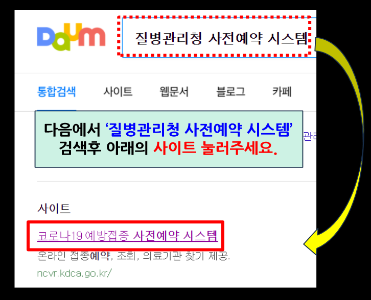 다음에서 질병관리청 사전예약 시스템을 검색하실경우, 아래와 같이 사이트가 나오는데요, 바로 더블클릭해주세요.