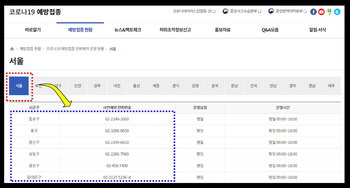 지역을 선택한후 아래에 군구별로 사전예약전화번호로 연락을 취하시면됩니다.