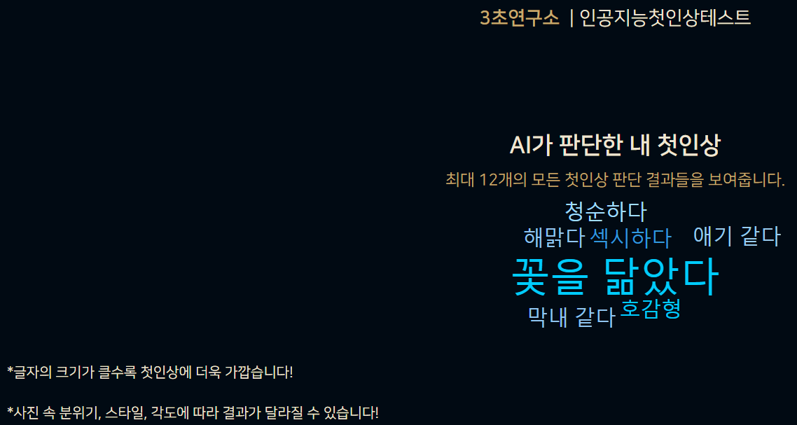 그리고 이렇게 아래로 내리면, AI가 판단한 내 첫인상의 판단 결과들을 12개 정도 보여주는데, 저는 몇 개가 안되네요. 글자의 크기가 클수록 첫인상에 더욱 가깝다고 하는데요, 저는 전생에 꽃이었나 봐요. 꽃을 닮았다는 뜻이 가장 크네요.