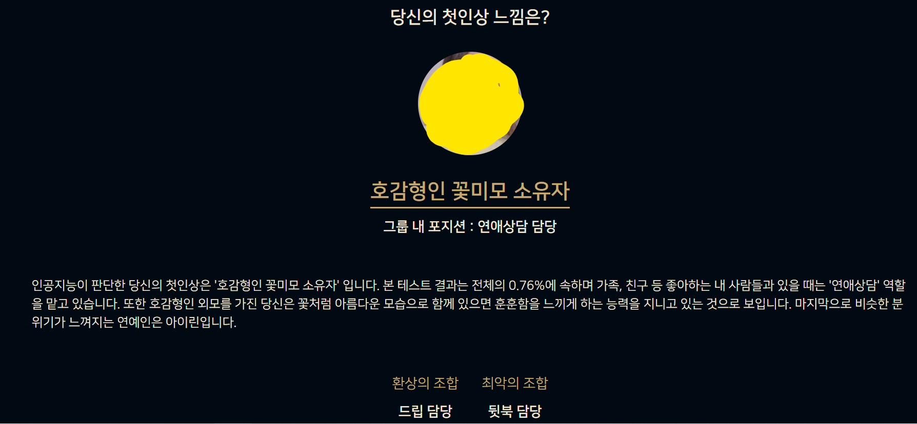 저는 호감형인 꽃미모 소유자로서 그룹 내 포지션은 연애상담 담당입니다. 제가 친구들 사이에서는 연애 상담자인데, AI가 정확하게 읽고 있어서 소름이 돋았습니다. 그리고 호감형인 외모를 가져 당신은 꽃처럼 아름다운 모습으로 함께 있으면 훈훈함을 느끼게 하는 능력을 지니고 있다고 하는데요, 너무 기쁜데요? 마지막으로는 비슷한 분위기가 느껴지는 연예인은 아이린이라고 합니다. 오늘 제 생일인가 봐요~^^