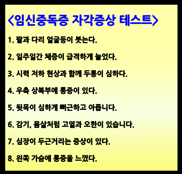 대표적인것은 부종, 고혈압, 단백뇨, 급격한 체중 증가가 있습니다. 질병이 진행이 되면서 증상은 두통과 폐부종 그리고 경련, 호흡곤란, 시야 흐림, 상복부 통증 등 중독증의 중증도를 평가하는 기준이 되기도 합니다