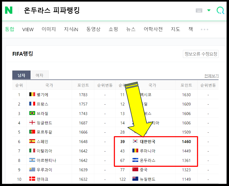 대한민국은 피파랭킹 39위, 그리고 루마니아 피파랭킹은 43위, 마지막으로 저희가 알아보고 있는 온두라스 피파랭킹은 67위입니다.