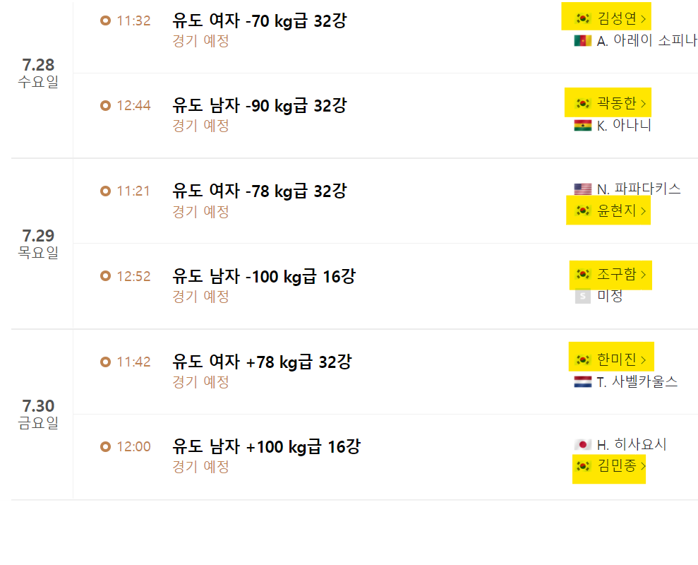 7월 28일 수요일 도쿄 올림픽 유도 일정